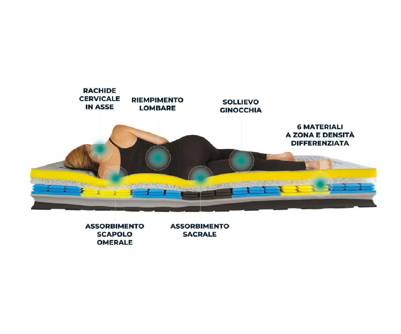 Base inferiore ad alta densità con canali di ventilazione e assorbimento nei punti spalla.